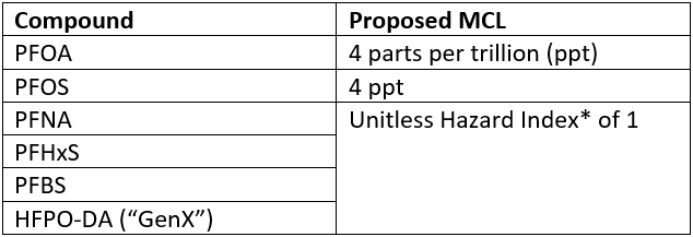 The proposed MCLs follow lifetime health advisory levels for PFOA, PFOS, GenX and PFBS issued by EPA in the summer of 2022. The health advisory levels for PFOA and PFOS are 0.004 parts per trillion, which is a level that cannot yet be reliably detected in laboratories. While the 4 ppt proposed MCL for PFOA and PFOS is low relative to the levels in place for other constituents, it is at least detectable using current technology.
