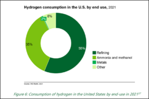According to DOE, the United States produces about 10 million metric tons of hydrogen per year. Total global production is around 90 million metric tons per year. Most of the hydrogen that’s consumed in the United States is used for petroleum refining and ammonia (for ammonium nitrate fertilizer) and methanol production. DOE’s draft Hydrogen Roadmap provides this helpful graph: