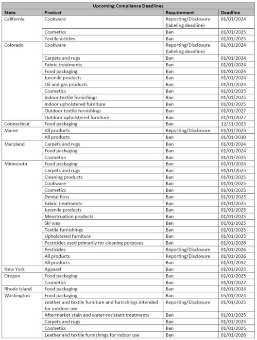 As states continue to move forward with emerging PFAS product restrictions, those who manufacture, distribute, and sell such products must prepare for the changing legal landscape. Below, we summarize the upcoming compliance dates for these state PFAS restrictions: