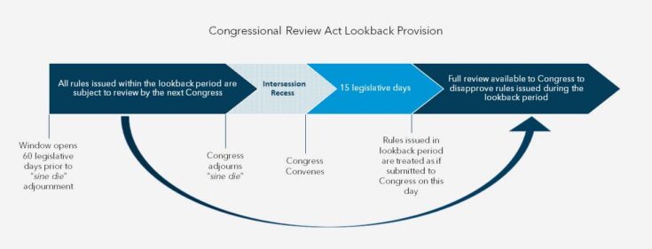 There is a period at the beginning of each new Administration during which rules issued near the end of the previous Administration are eligible for consideration under the CRA (i.e., the “look-back” period). See 5 U.S.C. § 801(d) and the graphic below.