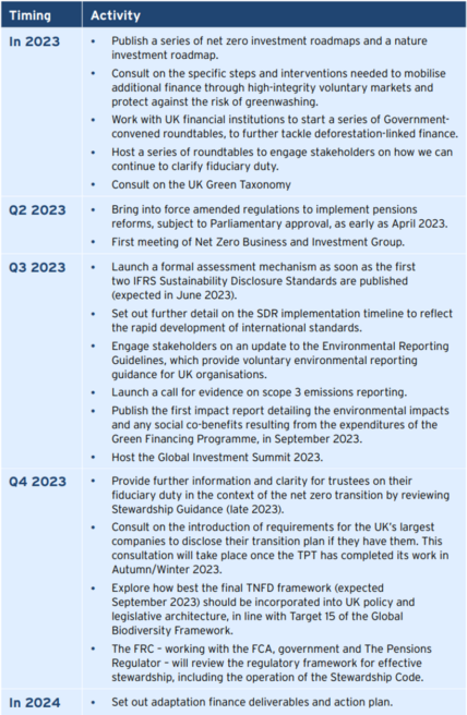 - Financial Stability – produce an effective green finance framework to ensure the finance sector has the information needed to manage risks from climate change and nature loss;