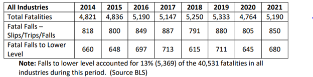 Despite the balanced application of the agency’s outreach, enforcement, and compliance assistance efforts, fatalities caused by falls continue to be a leading cause of death for all workers. A comparison of the Bureau of Labor Statistics (BLS) and OIS data between 2014 and 2021 revealed the following: