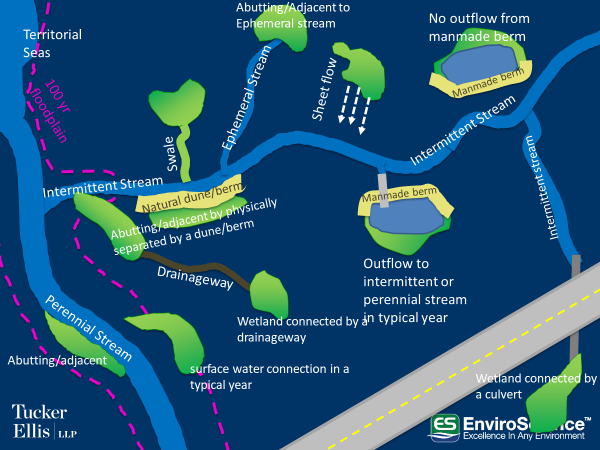 To provide a visual representation of what the Sackett decision means with regard to protections of wetlands, consider the following two images used in a recent presentation I made with Dr. Michael Liptak (Enviroscience). The first slide shows wetlands and various connections to perennial or intermittent streams (i.e. potentially regulated wetlands).