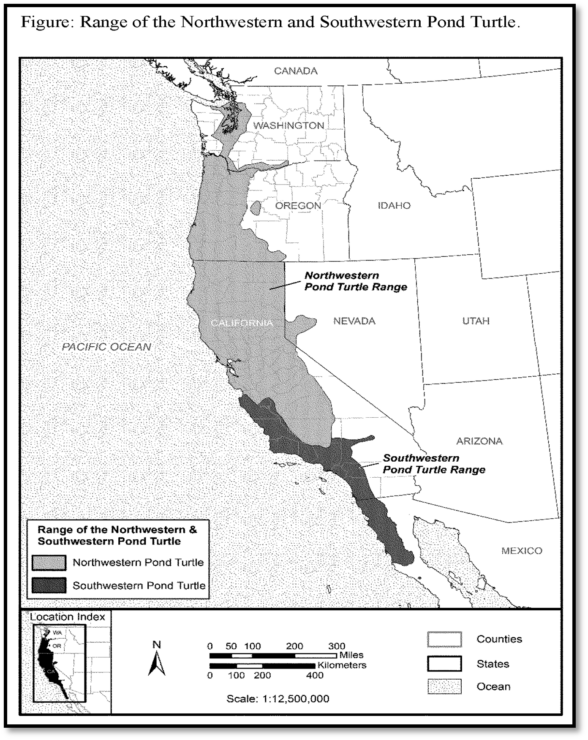 The U.S. Fish and Wildlife Service (FWS) has proposed listing the northwestern pond turtle (Actinemys marmorata) and the southwestern pond turtle (Actinemys pallida) as threatened species under the federal Endangered Species Act (ESA), with a final listing decision likely to occur next year. Listing the turtles would affect large swaths of California, Oregon, Washington, and parts of Nevada — the northwestern pond currently inhabits portions of Washington, Oregon, Nevada, as well as northern and central California, and the southwestern pond turtle is found in central and southern California from northern Monterey County into Baja California, Mexico. The turtles rely on aquatic habitats such as streams, ponds, and adjacent uplands, and they are found from cool coastal regions to the Mojave River watershed.