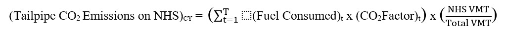 The final rule establishes a framework for assessing environmental performance on major roadways and reducing roadway-user emissions. First, the final rule creates a method for State DOTs and MPOs to measure and track GHG emissions based on percent changes in on-road tailpipe CO2 emissions. A GHG metric is used to calculate the GHG emissions measure. The GHG metric is defined as the calculation of tailpipe CO2 emissions on the mainline highways of the NHS for a given year, computed in million metric tons (mmt) and rounded to the nearest hundredth. The GHG metric formula is as follows:
