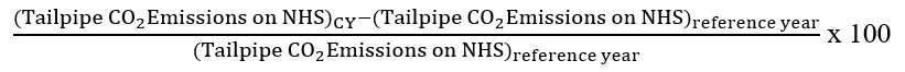 Note that State DOTs must use the above metric formula, but MPOs are granted flexibility in how they calculate the GHG metric. The GHG metric is then used in the GHG emissions measure, where the GHG emissions measure is the percent change in tailpipe CO2 emissions between the current year and the reference year, computed as follows: