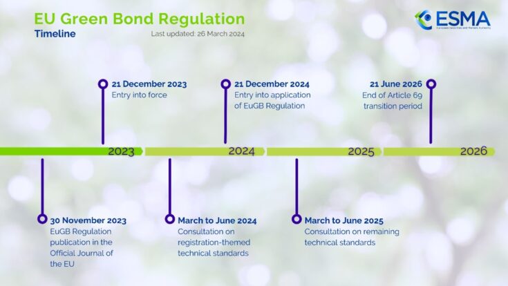 The ESMA also stated that it intends to address the remainder of its mandates under the EU Green Bond Standard Regulation in its second consultation package, which is due to be published in Q1 2025. Please see the below timeline, produced by the ESMA, for further information on the implementation of the EU Green Bond Standard Regulation.