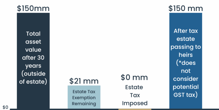 The chart below assumes that a $15 million asset in your estate appreciates at 8% each year for 30 years. If you pass this asset to your heirs when you die in 30 years, assuming an estate tax exemption at such time of $36 million ($15 million indexed for 3% inflation), then the net taxable estate of $114 million would be taxed at 40% for a total of $45 million and an after-tax estate of $105 million passing to your heirs.